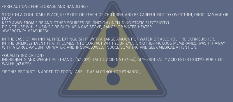 We are very particular about raw materials. Our products are manufactured at the highest standard domestic alcohol processing factory. Product standard values are strictly controlled for safe and secure use.